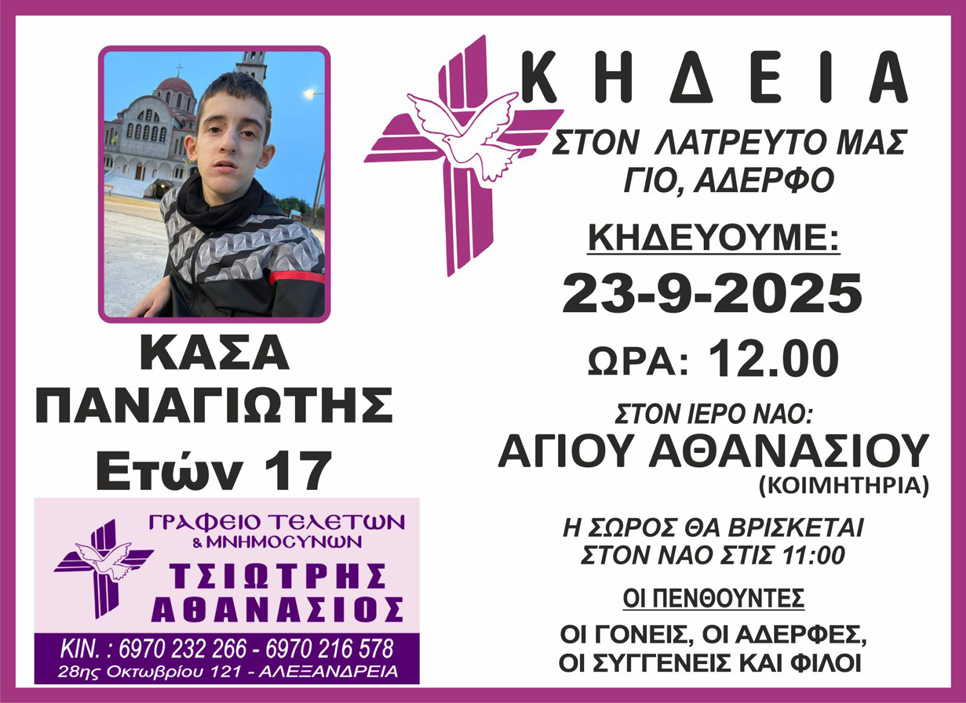 Η κηδεία του θα πραγματοποιηθεί την Τρίτη 23 Σεπτεμβρίου 2025 στις 12:00 στον Ιερό Ναό Αγίου Αθανασίου (Κοιμητήρια) στην Αλεξάνδρεια.