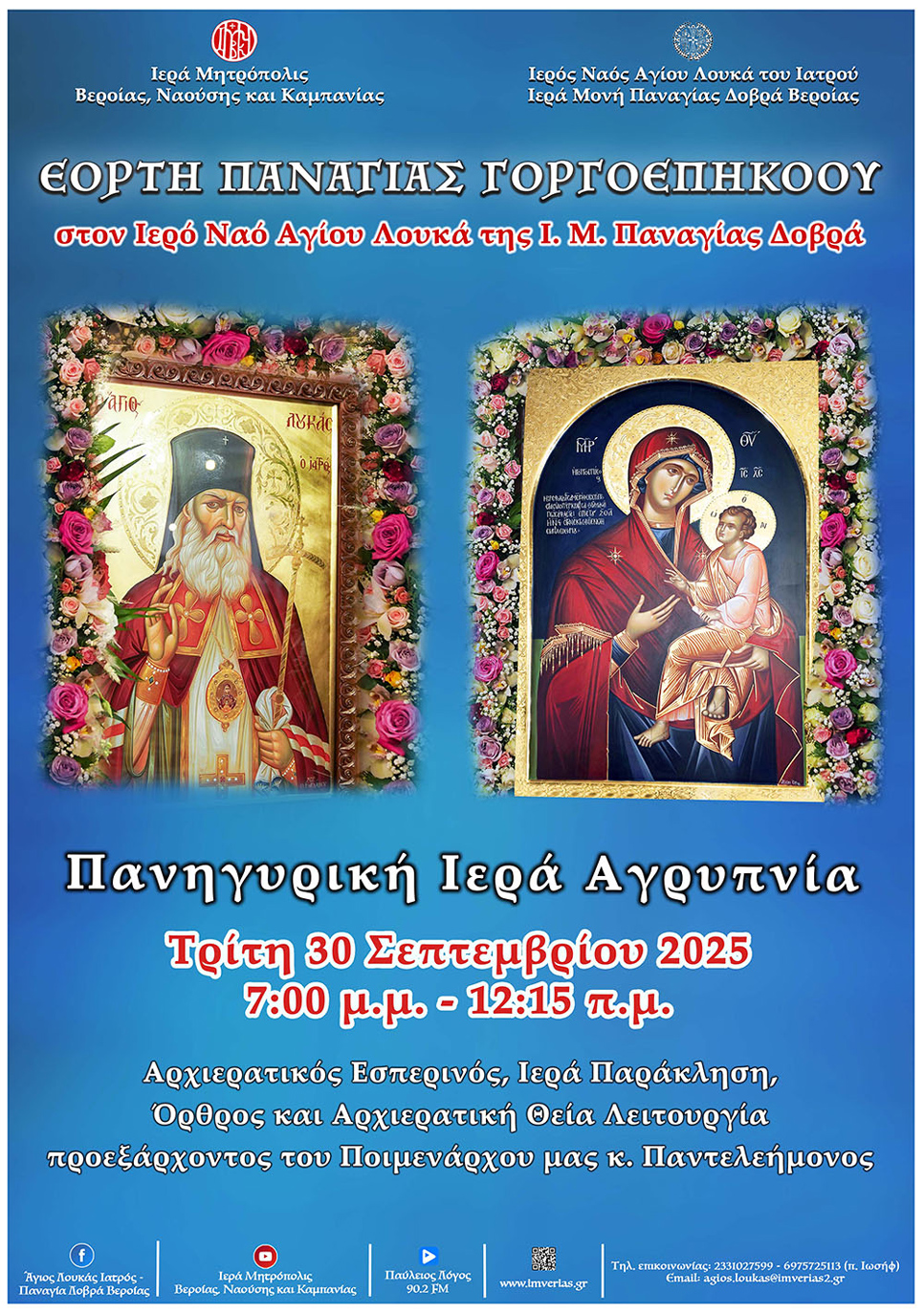 Ως εκ τούτου, την Τρίτη 30 Σεπτεμβρίου στις 7:00 μ.μ., θα τελεστεί – όπως κάθε Τρίτη – ο Αρχιερατικός Εσπερινός και η Ιερά Παράκληση του Αγίου Λουκά και στη συνέχεια θα ακολουθήσει Πανηγυρική Ιερά Αγρυπνία για την εορτή της Παναγίας της Γοργοεπηκόου, προεξάρχοντος του Ποιμενάρχου μας κ. Παντελεήμονος.
