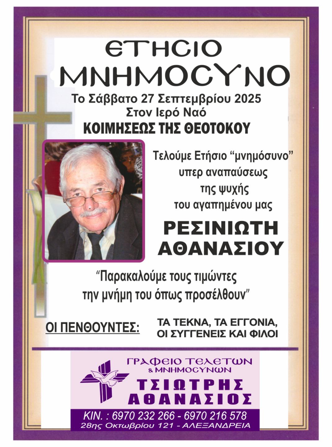 Το Σάββατο 27 Σεπτεμβρίου 2025 θα τελεστεί το ετήσιο μνημόσυνο υπέρ αναπαύσεως της ψυχής του Αθανάσιου Ρεσινιώτη.