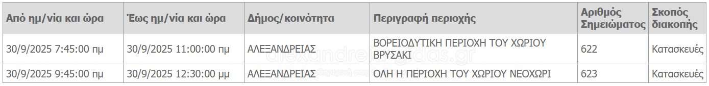 Προγραμματισμένες διακοπή ρεύματος λόγω κατασκευών θα πραγματοποιήσει την Τρίτη 30 Σεπτεμβρίου 2025 ο ΔΕΔΔΗΕ στον δήμο Αλεξάνδρειας.