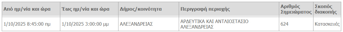 Προγραμματισμένη διακοπή ρεύματος λόγω κατασκευών θα πραγματοποιήσει την Τετάρτη 1 Οκτωβρίου 2025 ο ΔΕΔΔΗΕ στην Αλεξάνδρεια.