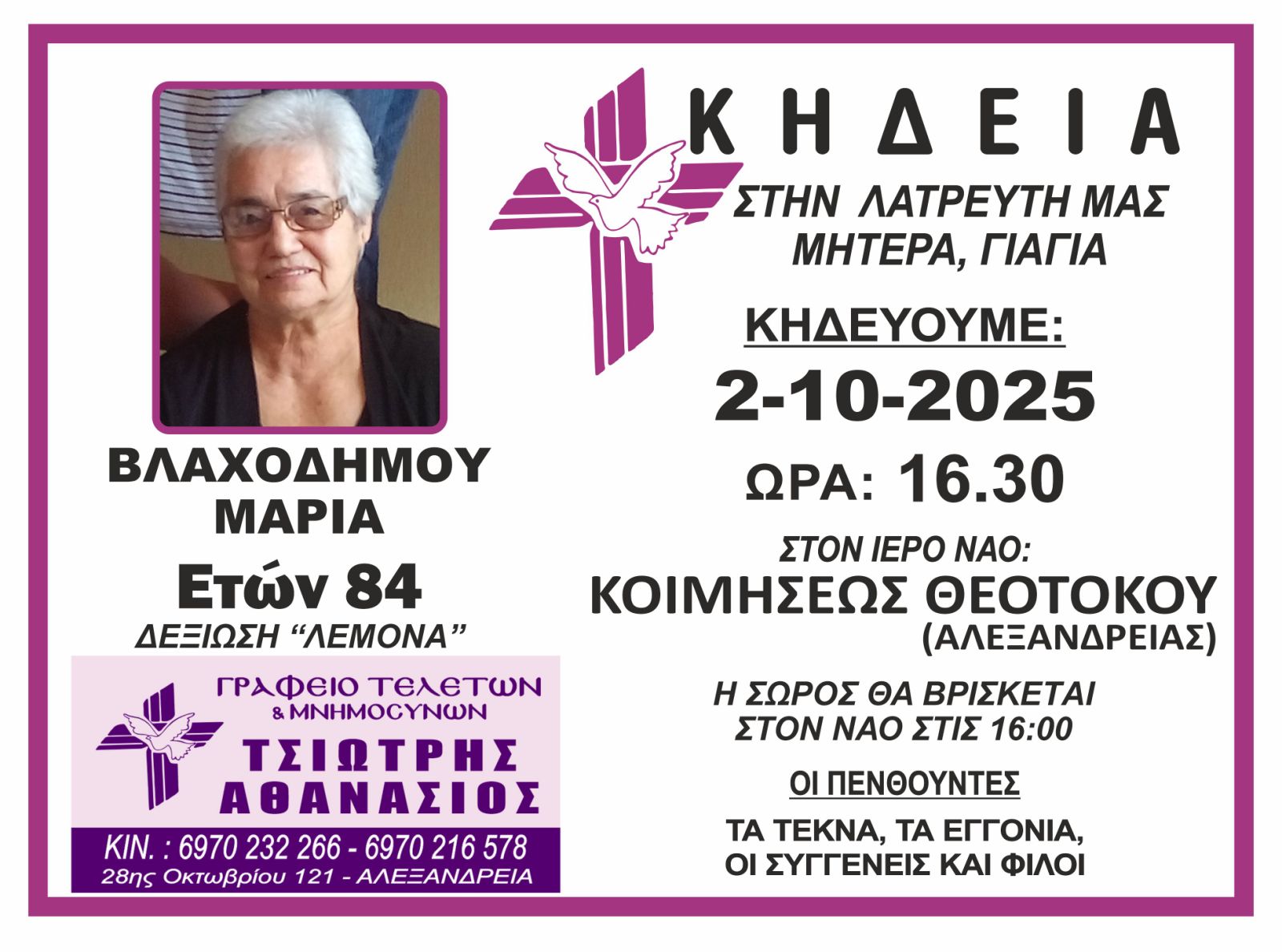 Η κηδεία της θα πραγματοποιηθεί σήμερα Πέμπτη 02 Οκτωβρίου 2025 στις 16:30 στον Ιερό Μητροπολιτικό Ναό Κοιμήσεως της Θεοτόκου στην Αλεξάνδρεια.