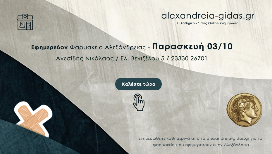 ΦΑΡΜΑΚΕΙΑ 3 Οκτωβρίου, 2025 posted by admin Share Ποιο φαρμακείο εφημερεύει σήμερα Παρασκευή στην Αλεξάνδρεια 🔊 Ακούστε το άρθρο κάνοντας κλικ Αλεξάνδρεια: (κλικ στην εικόνα παρακάτω για να καλέσετε απευθείας το φαρμακείο) Αφήστε μια απάντηση Ακύρωση απάντησηςΗ ηλ. διεύθυνση σας δεν δημοσιεύεται. Τα υποχρεωτικά πεδία σημειώνονται με *Σχόλιο * Όνομα Email Ιστότοπος Αποθήκευσε το όνομά μου, email, και τον ιστότοπο μου σε αυτόν τον πλοηγό για την επόμενη φορά που θα σχολιάσω.