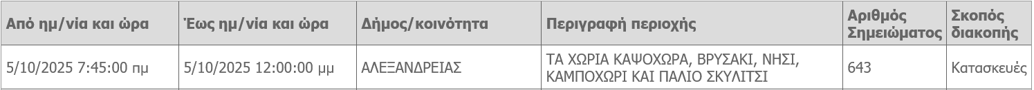 Προγραμματισμένες διακοπή ρεύματος λόγω κατασκευών θα πραγματοποιήσει την Κυριακή 05 Οκτωβρίου 2025 ο ΔΕΔΔΗΕ στον δήμο Αλεξάνδρειας.