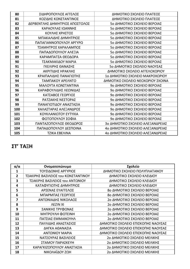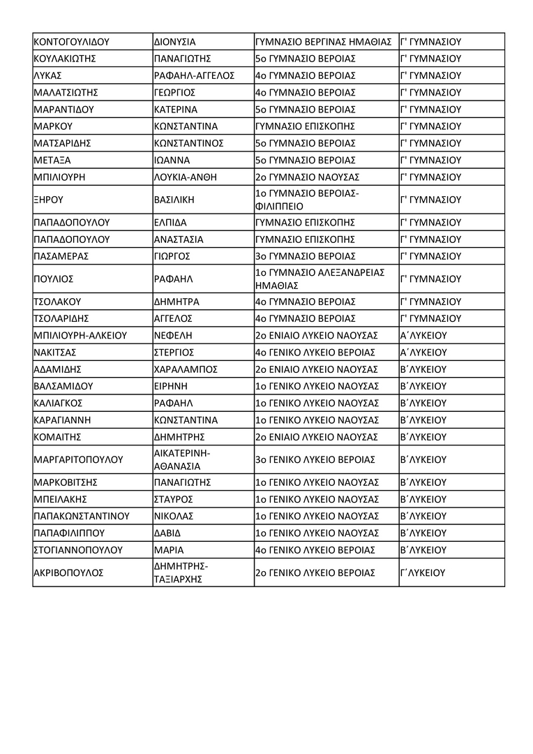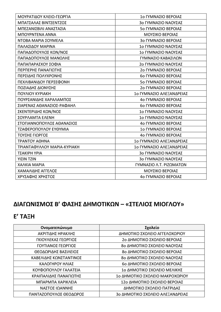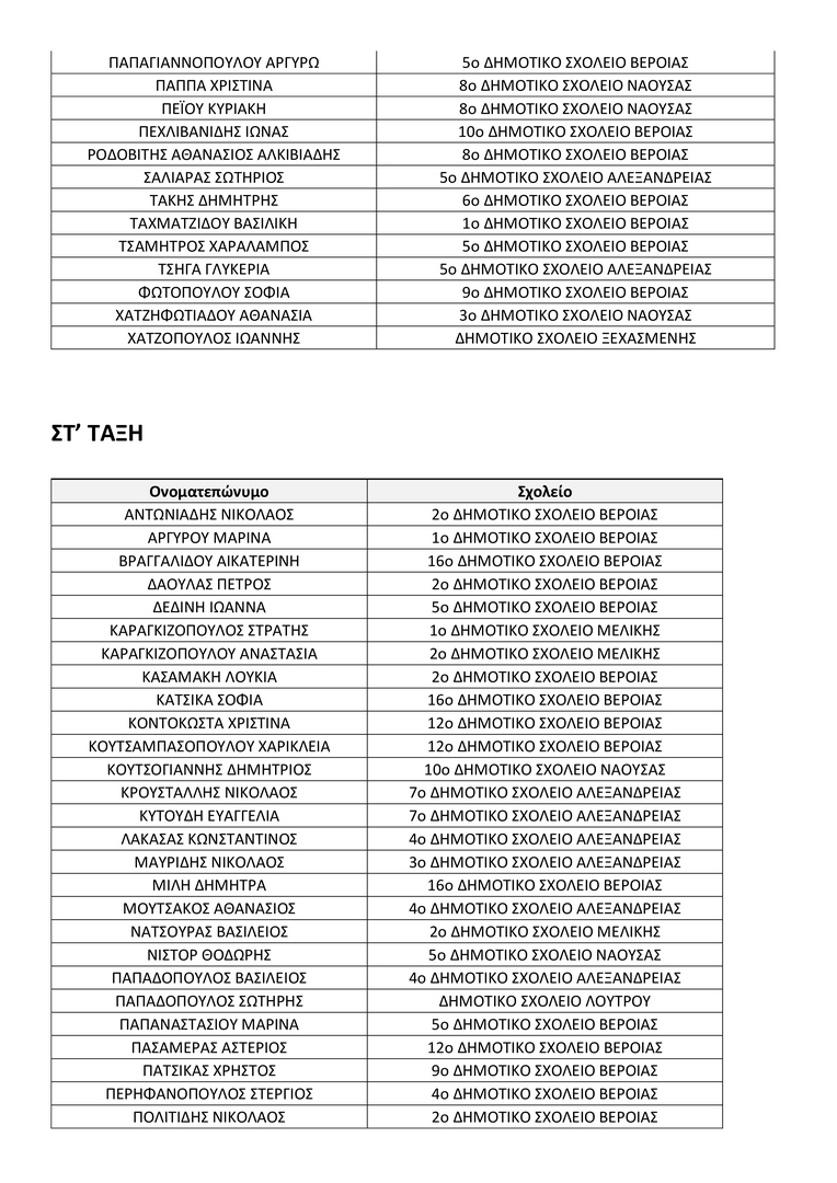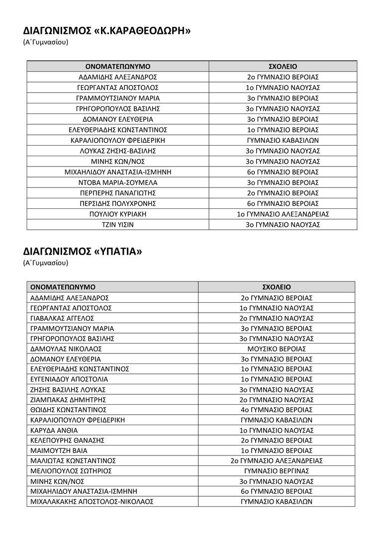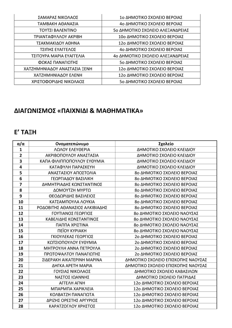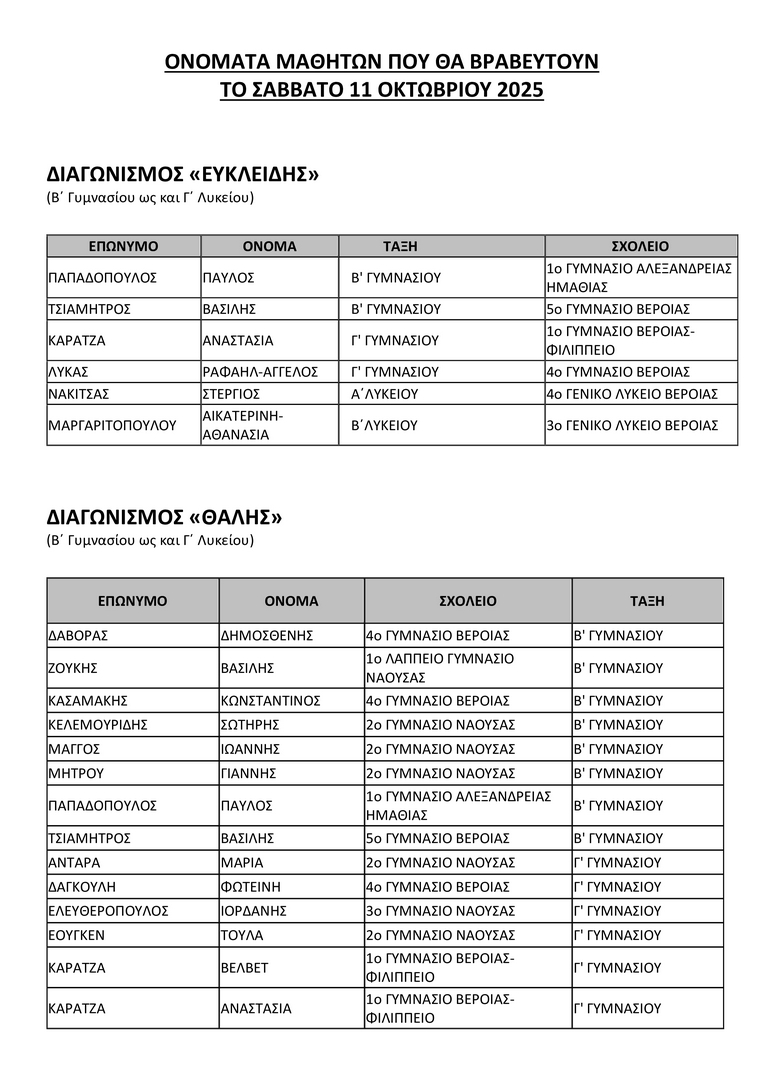 Το Παράρτημα Ημαθίας της Ελληνικής Μαθηματικής Εταιρείας βραβεύει τους μαθητές που διακρίθηκαν στους διαγωνισμούς: «Θαλής», «Ευκλείδης», «Υπατία», «Καραθεοδωρή», «Παιχνίδι και Μαθηματικά» και στο διαγωνισμό Β’ φάσης δημοτικών «Στέλιος Μιόγλου» για το σχολικό έτος 2024-2025.