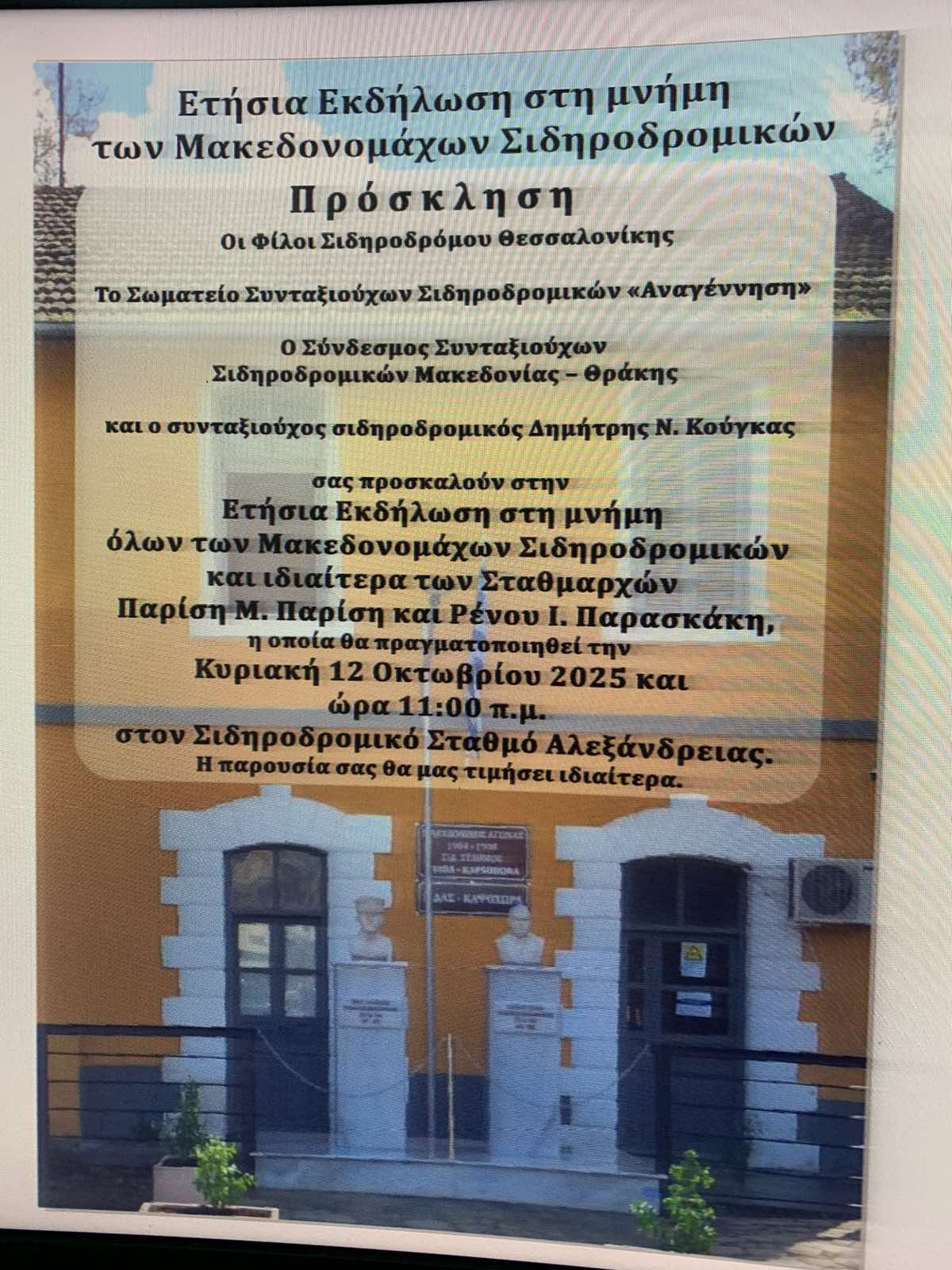 Οι Φίλοι Σιδηροδρόμου Θεσσαλονίκης, το Σωματείο Συνταξιούχων Σιδηροδρομικών «Αναγέννηση», ο Σύνδεσμος Συνταξιούχων Σιδηροδρομικών Μακεδονίας – Θράκης και ο συνταξιούχος σιδηροδρομικός Δημήτρης Ν. Κούγκας προσκαλούν το κοινό στην Ετήσια Εκδήλωση στη μνήμη όλων των Μακεδονομάχων Σιδηροδρομικών, και ιδιαίτερα των Σταθμαρχών Παρίση Μ. Παρίση και Ρένου Ι. Παρασκάκη.