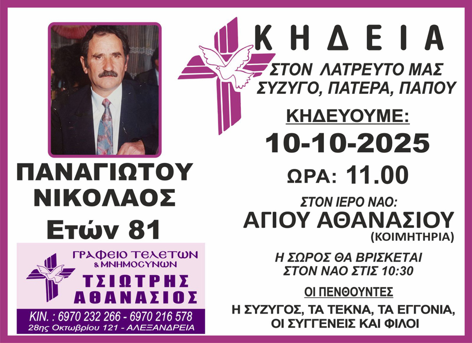 Η κηδεία του θα πραγματοποιηθεί την Παρασκευή 10 Οκτωβρίου 2025 στις 11:00 στον Ιερό Ναό Αγίου Αθανασίου (Κοιμητήρια) Αλεξάνδρειας.