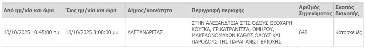 Προγραμματισμένες διακοπή ρεύματος λόγω κατασκευών θα πραγματοποιήσει την Παρασκευή 10 Οκτωβρίου 2025 ο ΔΕΔΔΗΕ στον δήμο Αλεξάνδρειας.