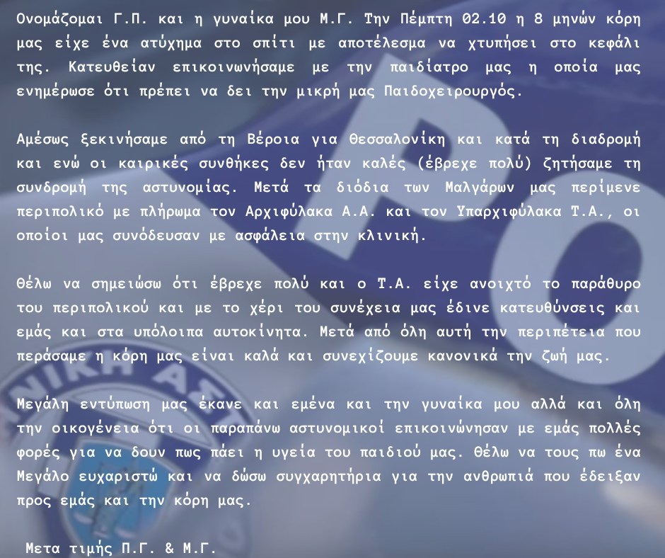 Ευχαριστήρια επιστολή έστειλαν στην Ελληνική Αστυνομία γονείς κοριτσιού 8 μηνών από τη πόλη της Βέροιας.