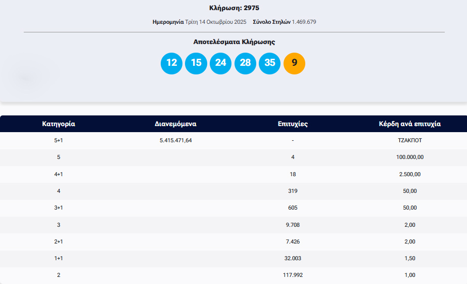 Τζακ ποτ σημειώθηκε στην κλήρωση του Τζόκερ της Τρίτης 14 Οκτωβρίου 2025.