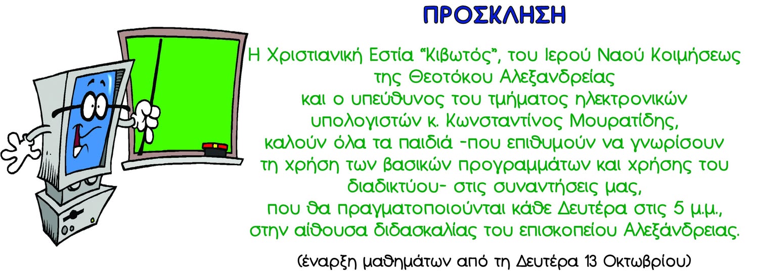 Η Χριστιανική Εστία “Κιβωτός” του Ιερού Μητροπολιτικού Ναού Κοιμήσεως της Θεοτόκου Αλεξάνδρειας ανακοίνωσε τις παρακάτω δράσεις: