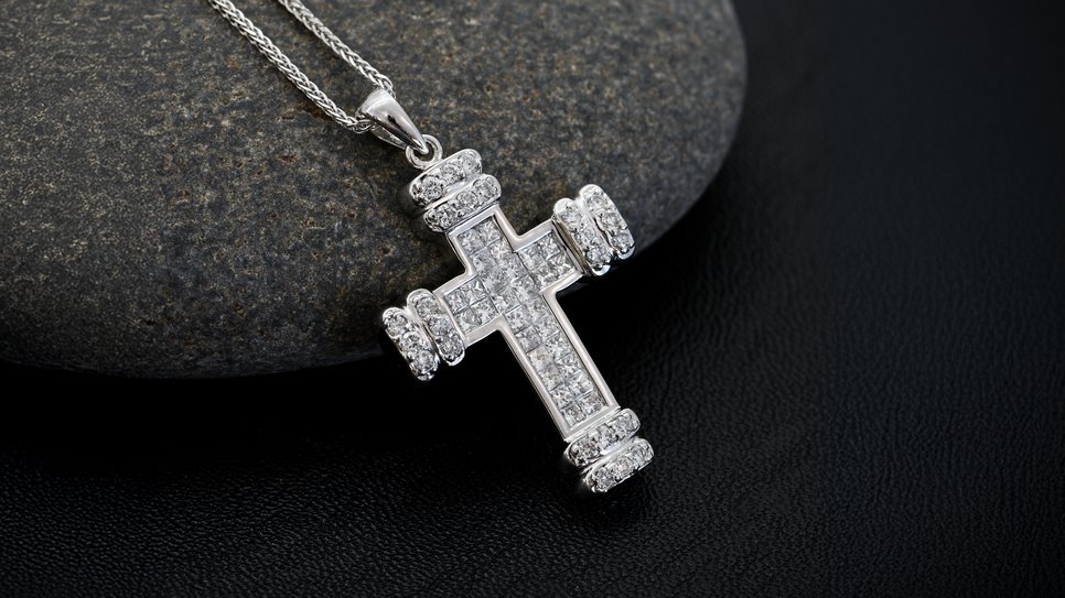 Ένα κόσμημα που συνδυάζει πνευματικότητα και πολυτέλεια, ιδανικό για όσους εκτιμούν τη διακριτική λάμψη και την αιώνια αξία των διαμαντιών.