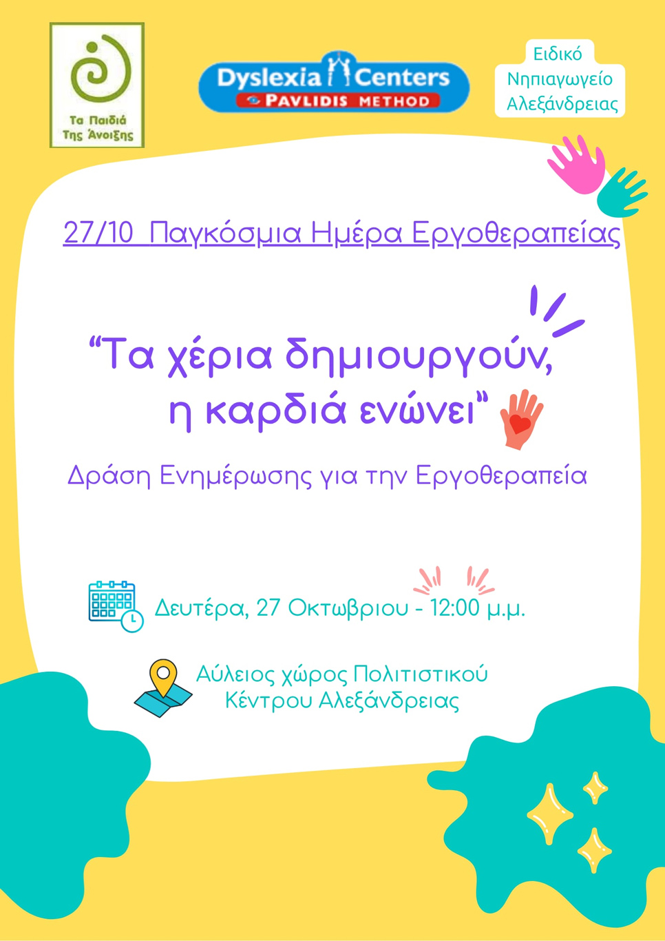 Με αφορμή την Παγκόσμια Ημέρα Εργοθεραπείας, τα Dyslexia Centers – Pavlidis Method Αλεξάνδρειας σε συνεργασία με τα Παιδιά της Άνοιξης και το Ειδικό Νηπιαγωγείο Αλεξάνδρειας προσκαλούν μικρούς και μεγάλους σε μια δράση ευαισθητοποίησης και βιωματικής εμπειρίας!