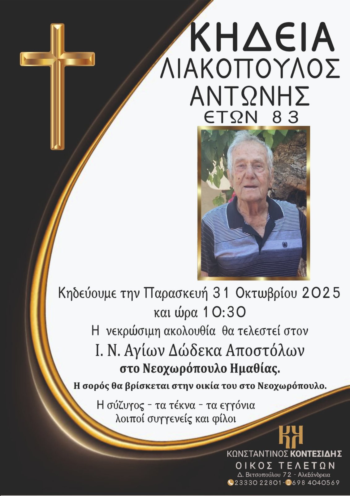Η νεκρώσιμη ακολουθία θα τελεστεί την Παρασκευή 31 Οκτωβρίου 2025 και ώρα 10:30 στον Ιερό Ναό Αγίων Δώδεκα Αποστόλων στο Νεοχωρόπουλο του δήμου Αλεξάνδρειας.