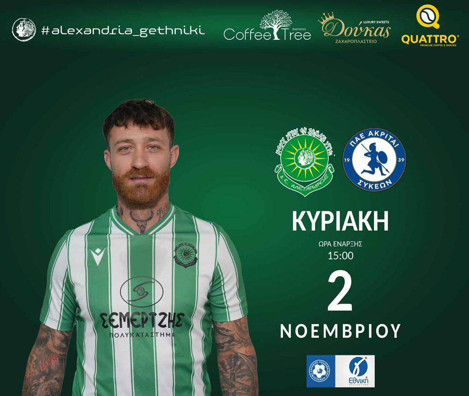 Η Α.Ε Αλεξάνδρειας προσκαλεί τον φίλαθλο κόσμο τής ομάδας μας στον κρίσιμο εντός έδρας αγώνα με αντίπαλο τούς Ακρίτες Συκεών την ερχόμενη Κυριακή στις 15 00 στο γήπεδο μας.
