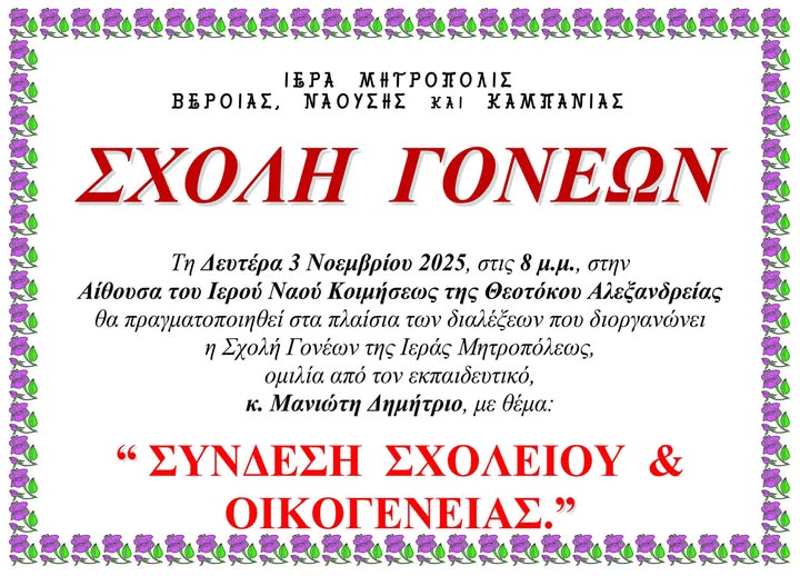 Στα πλαίσια της Σχολής Γονέων της Ιεράς Μητροπόλεώς μας, θα πραγματοποιηθεί διάλεξη, τη Δευτέρα 3 Νοεμβρίου 2025, στις 8 μ.μ., στην αίθουσα του Επισκοπείου του Ιερού Μητροπολιτικού Ναού Κοιμήσεως της Θεοτόκου Αλεξανδρείας, με θέμα: «Σύνδεση σχολείου και οικογένειας».