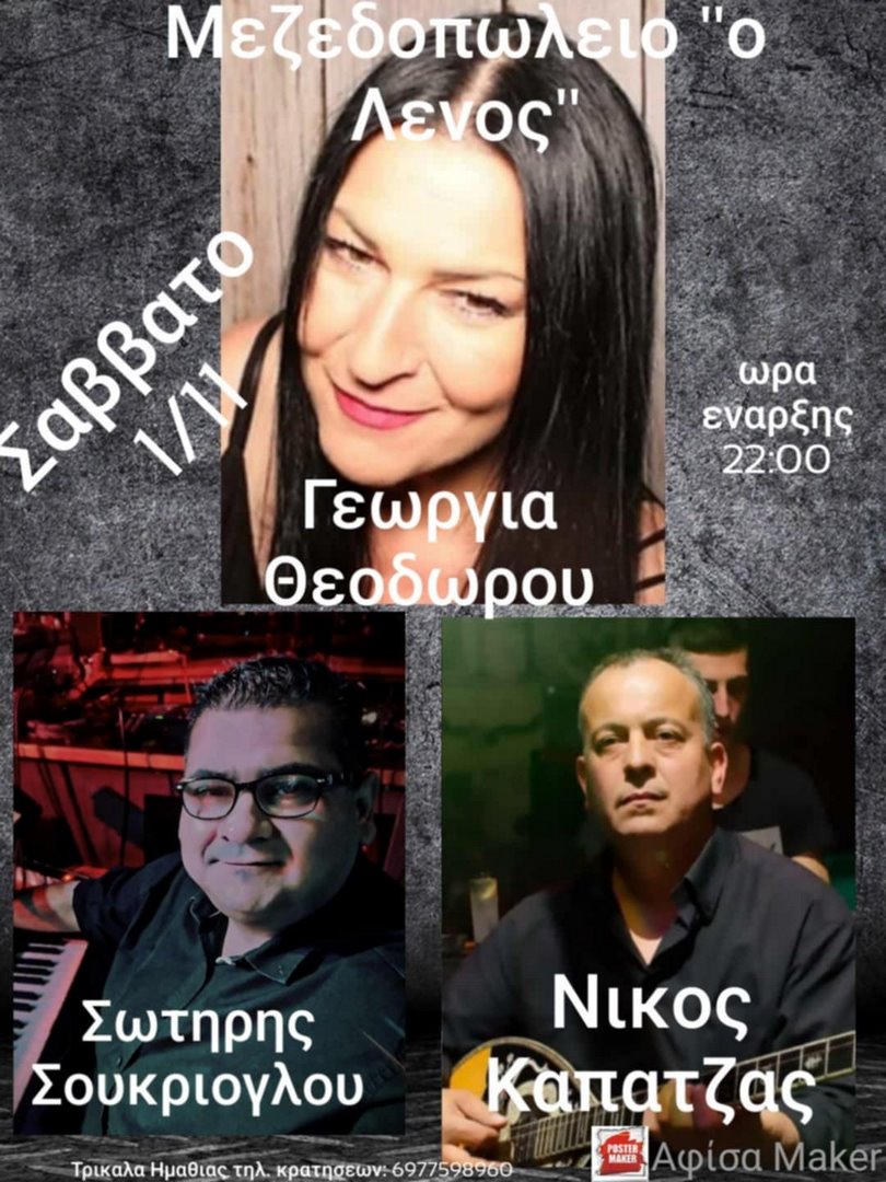 Σήμερα Σάββατο 1 Νοεμβρίου 2025, η ταβέρνα ΛΕΝΟΣ υποδέχεται τη Γεωργία Θεοδώρου στο τραγούδι, τον Νίκο Καπατζά στο μπουζούκι και τον Σωτήρη Σουκριογλου στα πλήκτρα για μία βραδιά γεμάτη ζωντανή μουσική και λαχταριστές γεύσεις.
