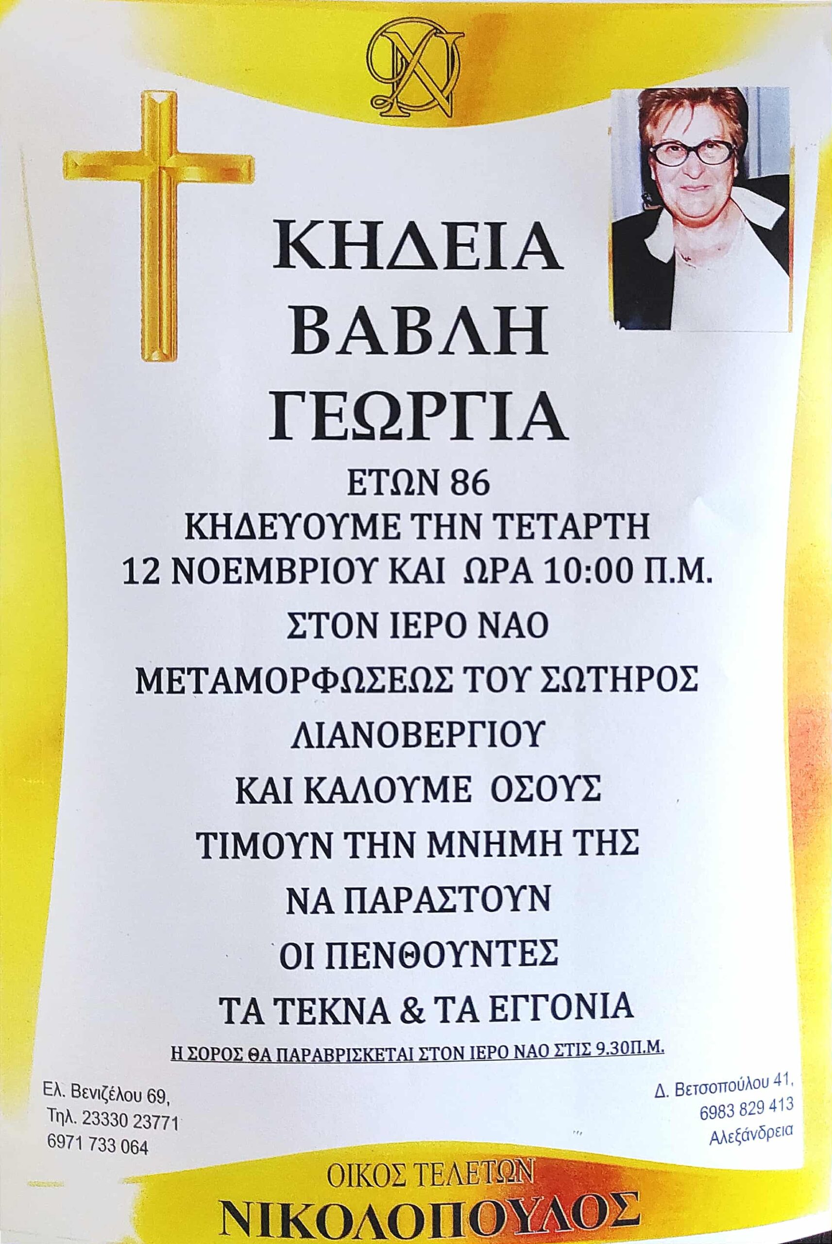 Η οικογένεια καλεί όσους τιμούν την μνήμη της, να παραστούν την Τετάρτη 12 Νοεμβρίου 2025 στις 10:00 π.μ. στον Ιερό Ναό Μεταμορφώσεως του Σωτήρος στο Λιανοβέργι του δήμου Αλεξάνδρειας.