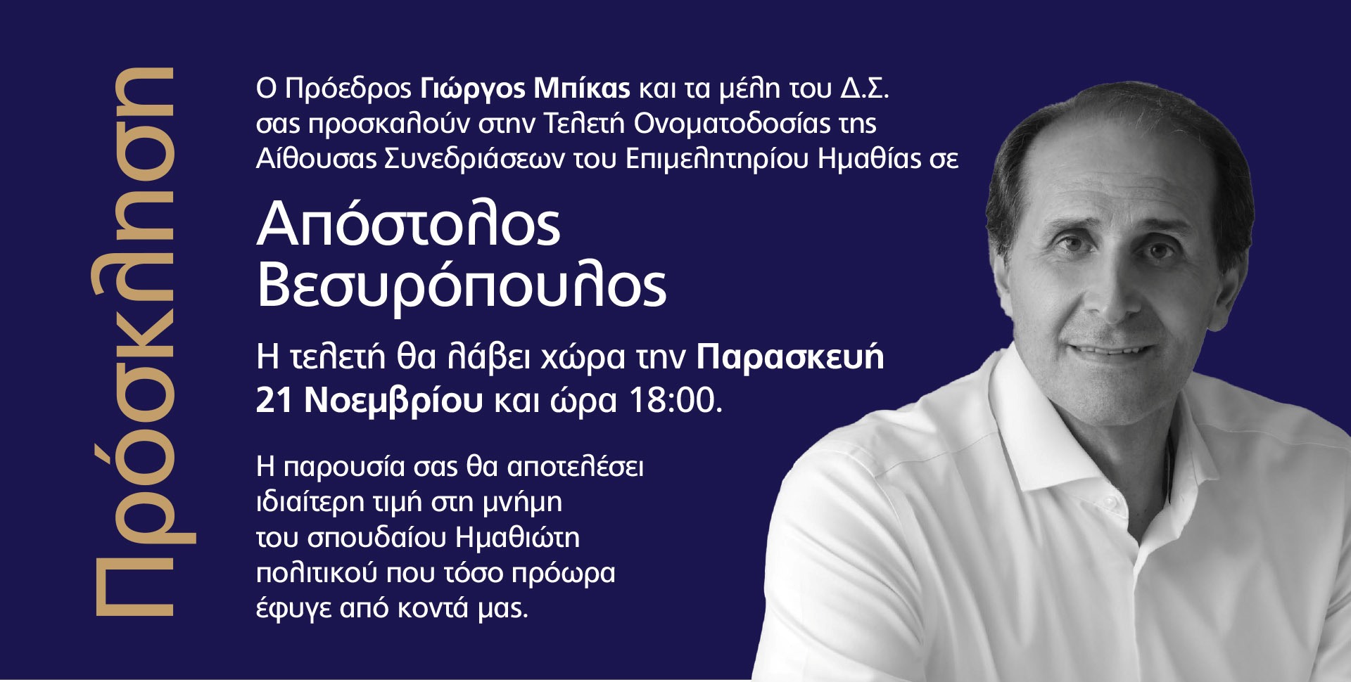 Η παρουσία σας θα αποτελέσει ιδιαίτερη τιμή στη μνήμη του σπουδαίου Ημαθιώτη πολιτικού που τόσο πρόωρα έφυγε από κοντά μας.