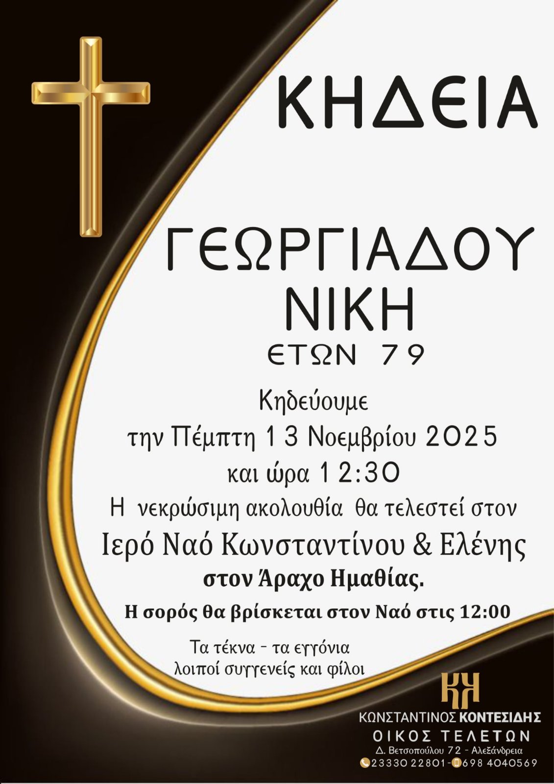 Η νεκρώσιμη ακολουθία θα τελεστεί σήμερα Πέμπτη 13 Νοεμβρίου 2025 και ώρα 12:30 στον Ιερό Ναό Αγίων Κωνσταντίνου και Ελένης στον Άραχο του δήμου Αλεξάνδρειας.