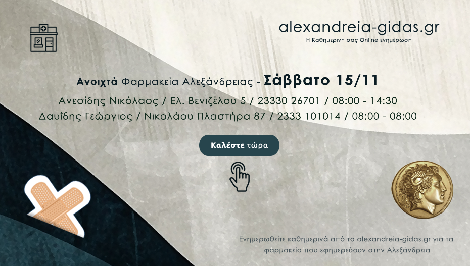 ΦΑΡΜΑΚΕΙΑ 15 Νοεμβρίου, 2025 posted by admin Share Ποια φαρμακεία είναι ανοιχτά σήμερα Σάββατο στην Αλεξάνδρεια 🔊 Ακούστε το άρθρο κάνοντας κλικ Αλεξάνδρεια: (κλικ στην εικόνα παρακάτω για να καλέσετε απευθείας το φαρμακείο) Αφήστε μια απάντηση Ακύρωση απάντησηςΗ ηλ. διεύθυνση σας δεν δημοσιεύεται. Τα υποχρεωτικά πεδία σημειώνονται με *Σχόλιο * Όνομα Email Ιστότοπος Αποθήκευσε το όνομά μου, email, και τον ιστότοπο μου σε αυτόν τον πλοηγό για την επόμενη φορά που θα σχολιάσω.