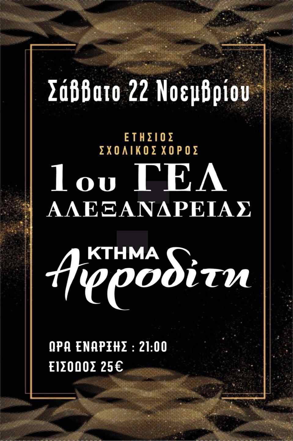 Ο Σύλλογος Γονέων και Κηδεμόνων του 1ου ΓΕΛ Αλεξάνδρειας προσκαλεί μαθητές, γονείς και φίλους στον φετινό χορό αποφοίτησης της Γ΄ τάξης, που θα πραγματοποιηθεί στο Κτήμα Αφροδίτη, το Σάββατο 22 Νοεμβρίου 2025, στις 21:00.