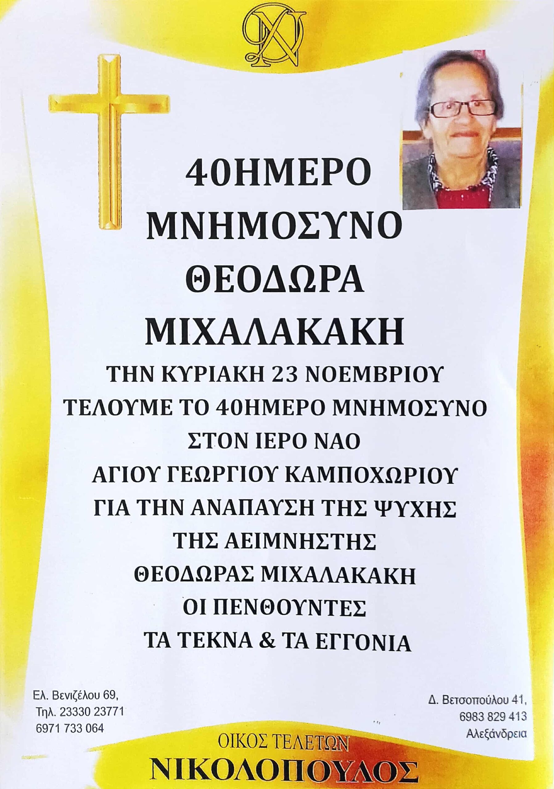 Την Κυριακή 23 Νοεμβρίου 2025 θα τελεσθεί το 4οήμερο μνημόσυνο για την ανάπαυση της ψυχής της αείμνηστης Θεοδώρας Μιχαλακάκη.