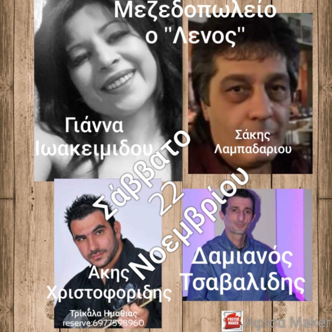To Σάββατο 22 Νοεμβρίου 2025, η ταβέρνα ΛΕΝΟΣ υποδέχεται την Γιάννα Ιωακειμίδου στο τραγούδι, και τους μουσικούς Σάκη Λαμπαδαρίου, Άκη Χριστοφορίδη και Δαμιανό Τσαβαλίδη για μία βραδιά γεμάτη ζωντανή μουσική και λαχταριστές γεύσεις.