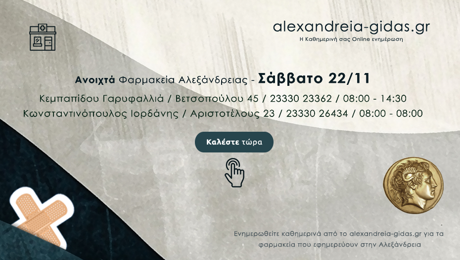ΦΑΡΜΑΚΕΙΑ 22 Νοεμβρίου, 2025 posted by admin Share Ποια φαρμακεία είναι ανοιχτά σήμερα Σάββατο στην Αλεξάνδρεια 🔊 Ακούστε το άρθρο κάνοντας κλικ Αλεξάνδρεια: (κλικ στην εικόνα παρακάτω για να καλέσετε απευθείας το φαρμακείο) Αφήστε μια απάντηση Ακύρωση απάντησηςΗ ηλ. διεύθυνση σας δεν δημοσιεύεται. Τα υποχρεωτικά πεδία σημειώνονται με *Σχόλιο * Όνομα Email Ιστότοπος Αποθήκευσε το όνομά μου, email, και τον ιστότοπο μου σε αυτόν τον πλοηγό για την επόμενη φορά που θα σχολιάσω.