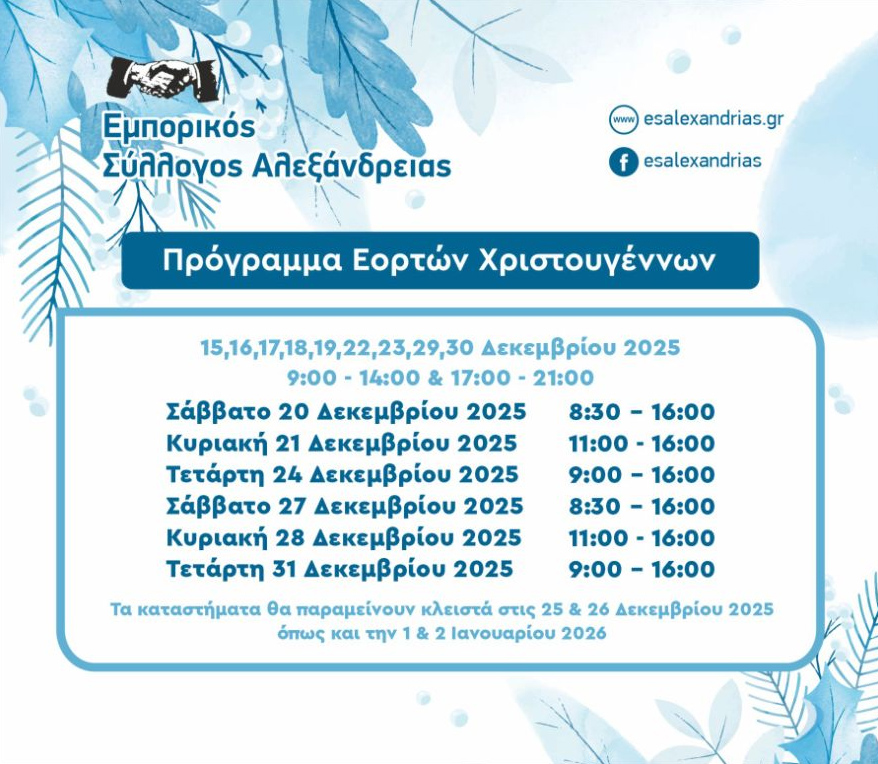 Ανακοίνωση για το πρόγραμμα λειτουργίας των καταστημάτων της Αλεξάνδρειας στη διάρκεια των εορτών των Χριστουγέννων και της Πρωτοχρονιάς εξέδωσε ο Εμπορικός Σύλλογος Αλεξάνδρειας.