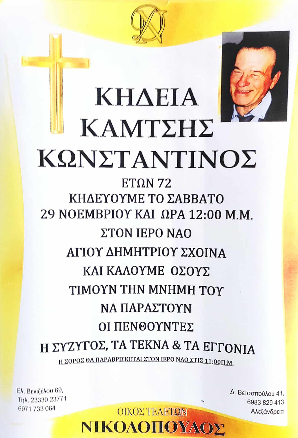 Η οικογένεια καλεί όσους τιμούν την μνήμη του, να παραστούν το Σάββατο 29 Νοεμβρίου 2025 στις 12:00 μ.μ. στον Ιερό Ναό του Αγίου Δημητρίου στον Σχοινά του δήμου Αλεξάνδρειας.