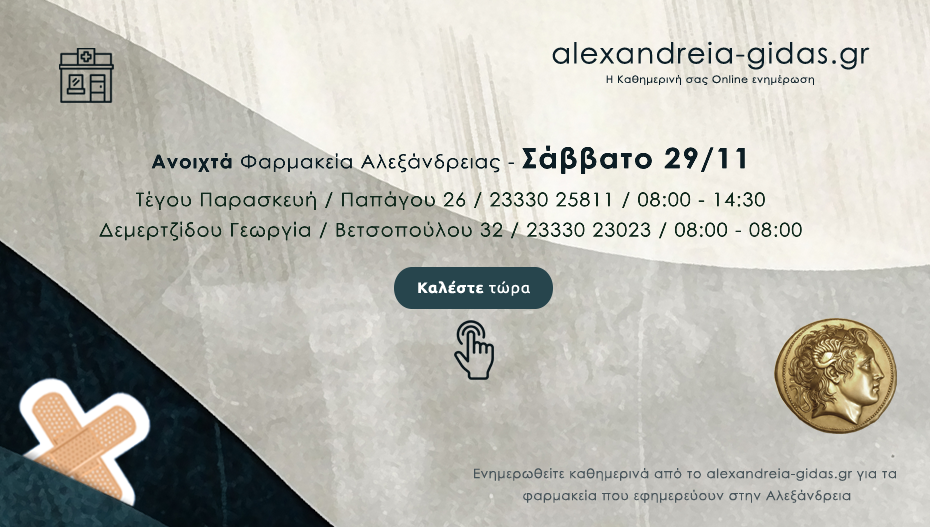 ΦΑΡΜΑΚΕΙΑ 29 Νοεμβρίου, 2025 posted by admin Share Ποια φαρμακεία είναι ανοιχτά σήμερα Σάββατο στην Αλεξάνδρεια 🔊 Ακούστε το άρθρο κάνοντας κλικ Αλεξάνδρεια: (κλικ στην εικόνα παρακάτω για να καλέσετε απευθείας το φαρμακείο) Αφήστε μια απάντηση Ακύρωση απάντησηςΗ ηλ. διεύθυνση σας δεν δημοσιεύεται. Τα υποχρεωτικά πεδία σημειώνονται με *Σχόλιο * Όνομα Email Ιστότοπος Αποθήκευσε το όνομά μου, email, και τον ιστότοπο μου σε αυτόν τον πλοηγό για την επόμενη φορά που θα σχολιάσω.
