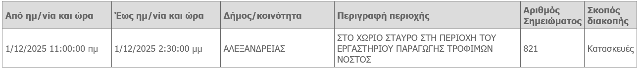Προγραμματισμένη διακοπή ρεύματος λόγω κατασκευών θα πραγματοποιήσει την Δευτέρα 1 Δεκεμβρίου 2025 ο ΔΕΔΔΗΕ στον δήμο Αλεξάνδρειας.