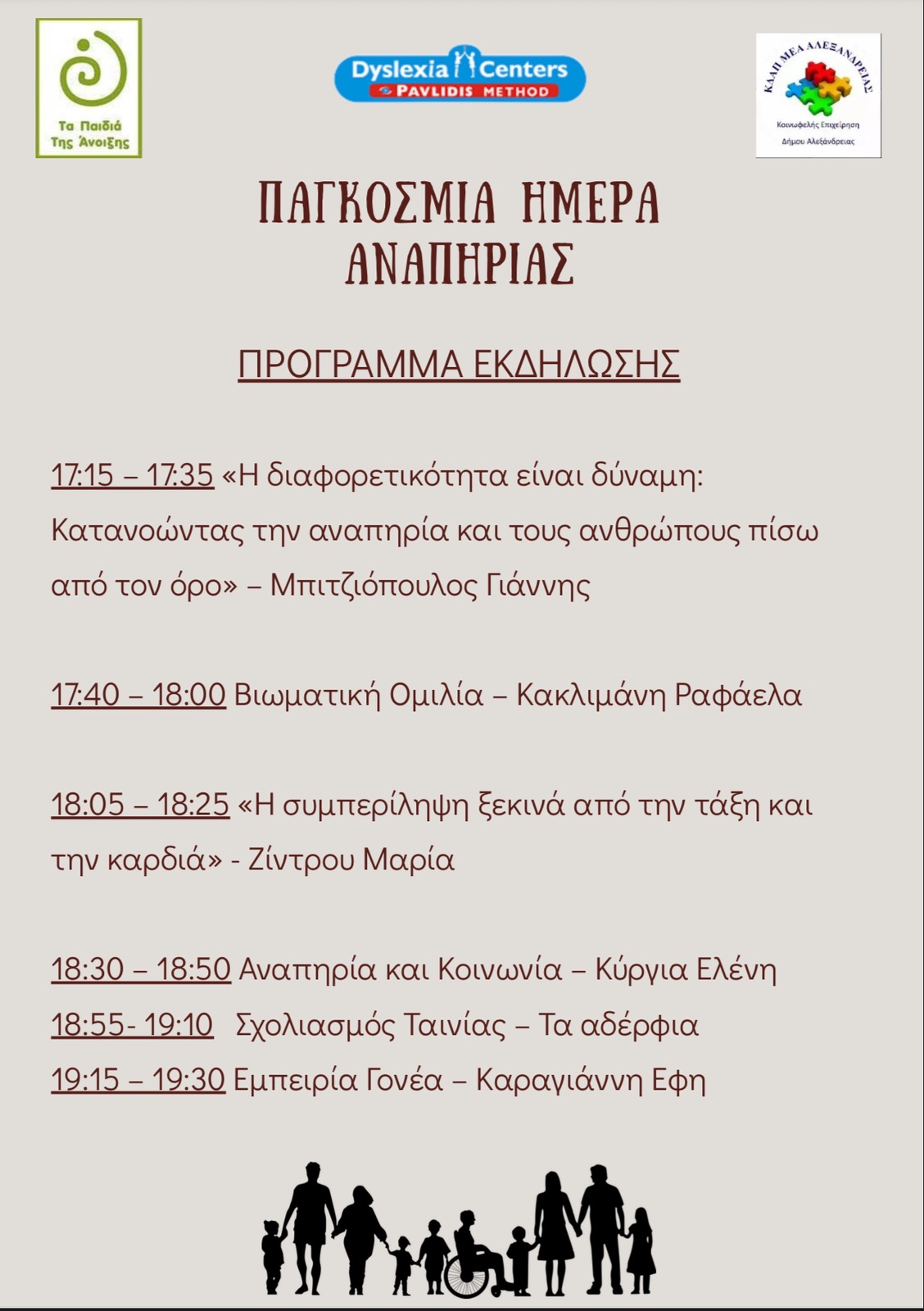 Με αφορμή την Παγκόσμια Ημέρα Αναπηρίας (3/12), το Dyslexia Centers Pavlidis Method, τα Παιδιά της Άνοιξης και το ΚΔΑΠ ΜΕΑ Αλεξάνδρειας διοργανώνουν μια ξεχωριστή δράση αφιερωμένη στη συμπερίληψη, την αποδοχή και τον σεβασμό στη διαφορετικότητα — και σας προσκαλούμε να είστε μαζί μας!