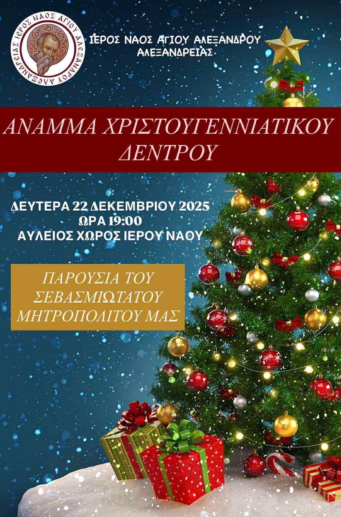 Το άναμμα του χριστουγεννιάτικου δέντρου θα γίνει φέτος στις 22 Δεκεμβρίου 2025 στον Ιερό Ναό του Αγίου Αλέξανδρου στην Αλεξάνδρεια.