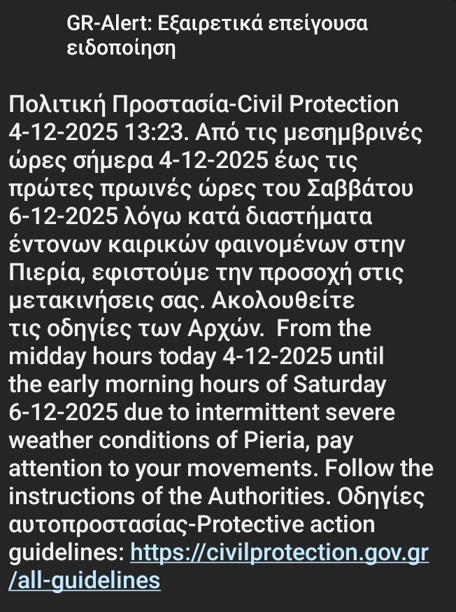 Ήχησε το sms του της Πολιτικής προστασίας στα κινητά και της Αλεξάνδρειας το μεσημέρι της Πέμπτης 4 Δεκεμβρίου 2025.