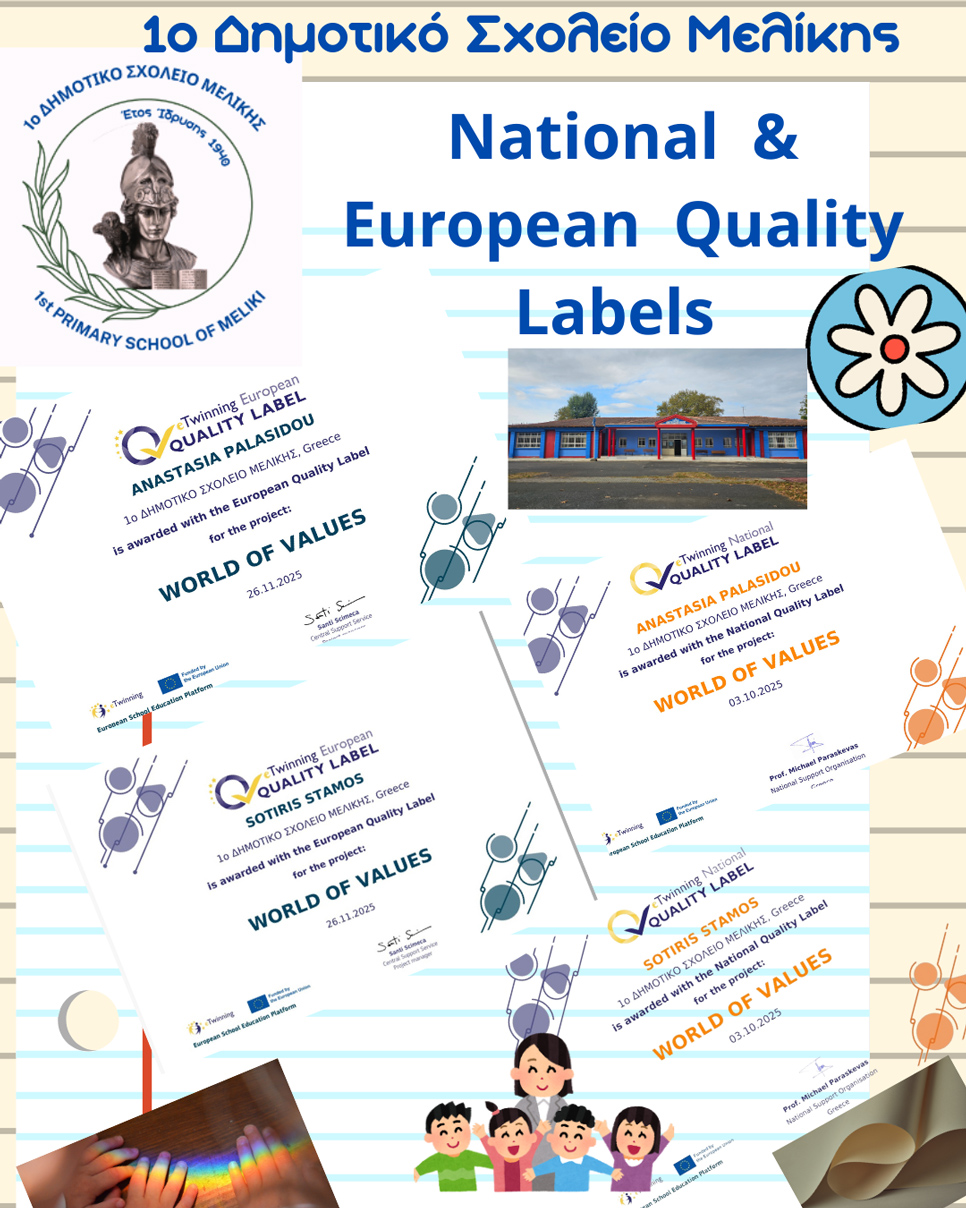 Μια ακόμη σημαντική επιτυχία καταγράφει το 1ο Δημοτικό Σχολείο Μελίκης, καθώς οι περσινές τάξεις Ε΄ και ΣΤ΄ τιμήθηκαν με Εθνικές και Ευρωπαϊκές Ετικέτες Ποιότητας για τη συμμετοχή τους στο πρόγραμμα e-Twinning «World of Values». Το έργο υλοποιήθηκε με συντονίστρια την εκπαιδευτικό Αγγλικών κ. Αναστασία Παλασίδου και τον Διευθυντή κ. Σωτήρη Στάμο .