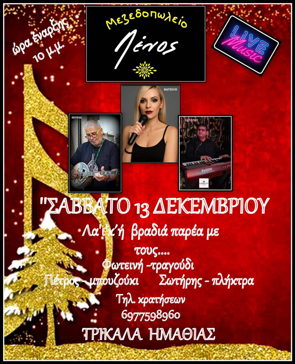To Σάββατο 13 Δεκεμβρίου 2025, η ταβέρνα ΛΕΝΟΣ υποδέχεται την Φωτεινή στο τραγούδι, και τους μουσικούς Πέτρο στο μπουζούκι και Σωτήρη στα πλήκτρα.