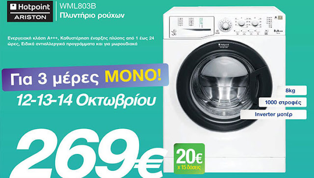 Δείτε τιμή στο πλυντήριο ARISTON που ισχύει για τρεις ημέρες από αύριο Πέμπτη 12 Οκτωβρίου μέχρι και το Σάββατο 14 Οκτωβρίου!