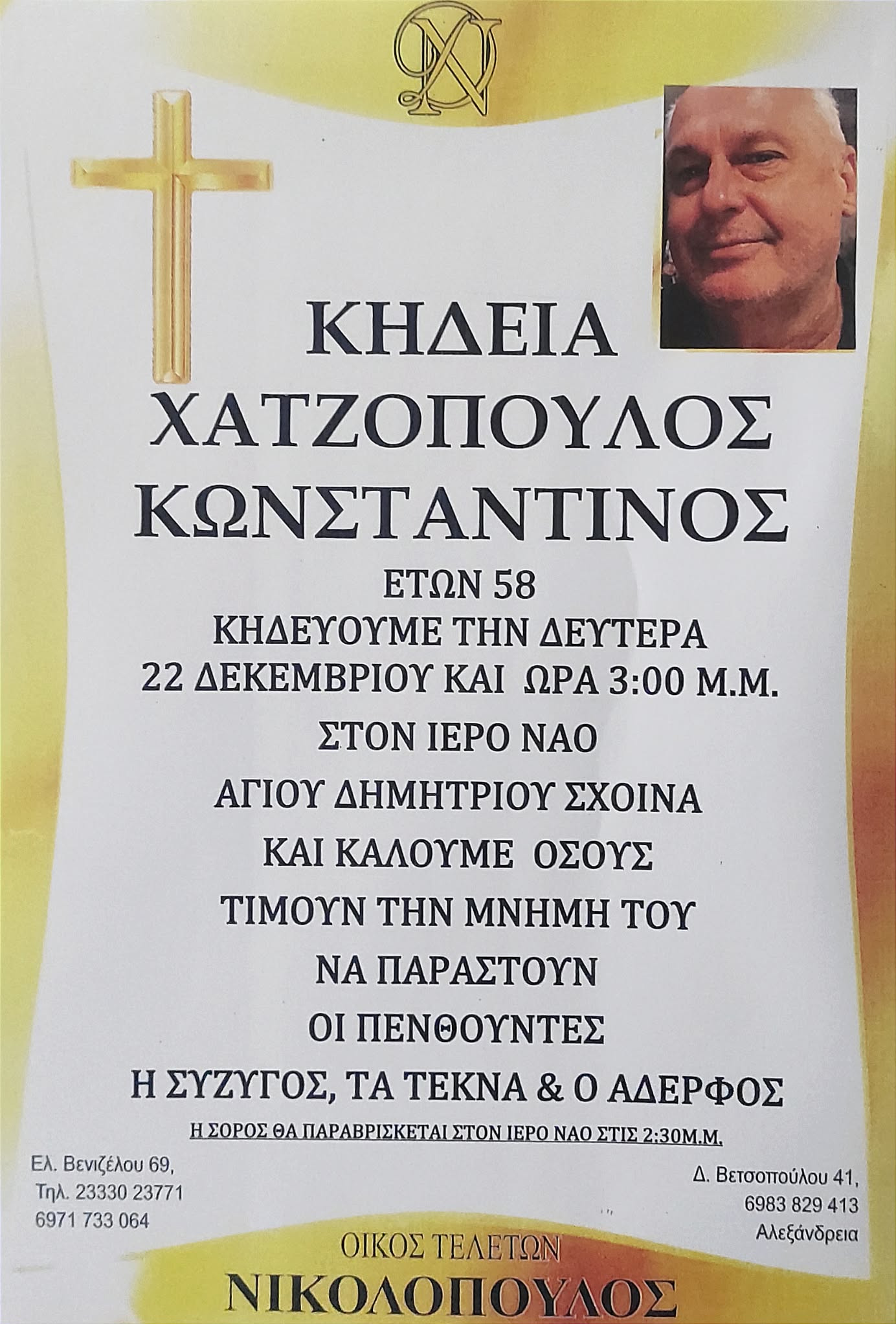Η οικογένεια καλεί όσους τιμούν την μνήμη του, να παραστούν σήμερα Δευτέρα 22 Δεκεμβρίου 2025 στις 3:00 μ.μ. στον Ιερό Ναό Αγίου Δημητρίου στον Σχοινά του δήμου Αλεξάνδρειας.