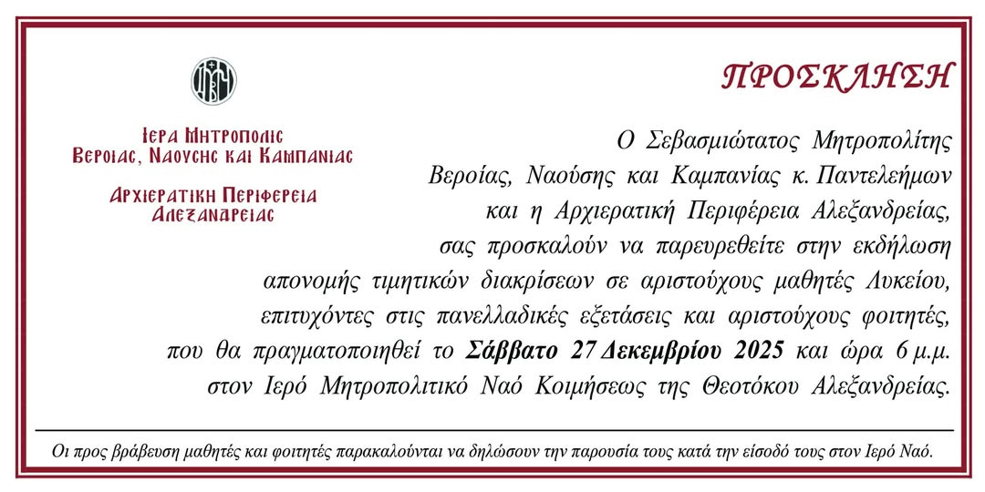 Ο Σεβασμιώτατος Μητροπολίτης Βεροίας, Ναούσης και Καμπανίας κ. Παντελεήμων, καθώς και η Αρχιερατική Περιφέρεια Αλεξανδρείας, απευθύνουν πρόσκληση προς το κοινό να παραστεί στην: