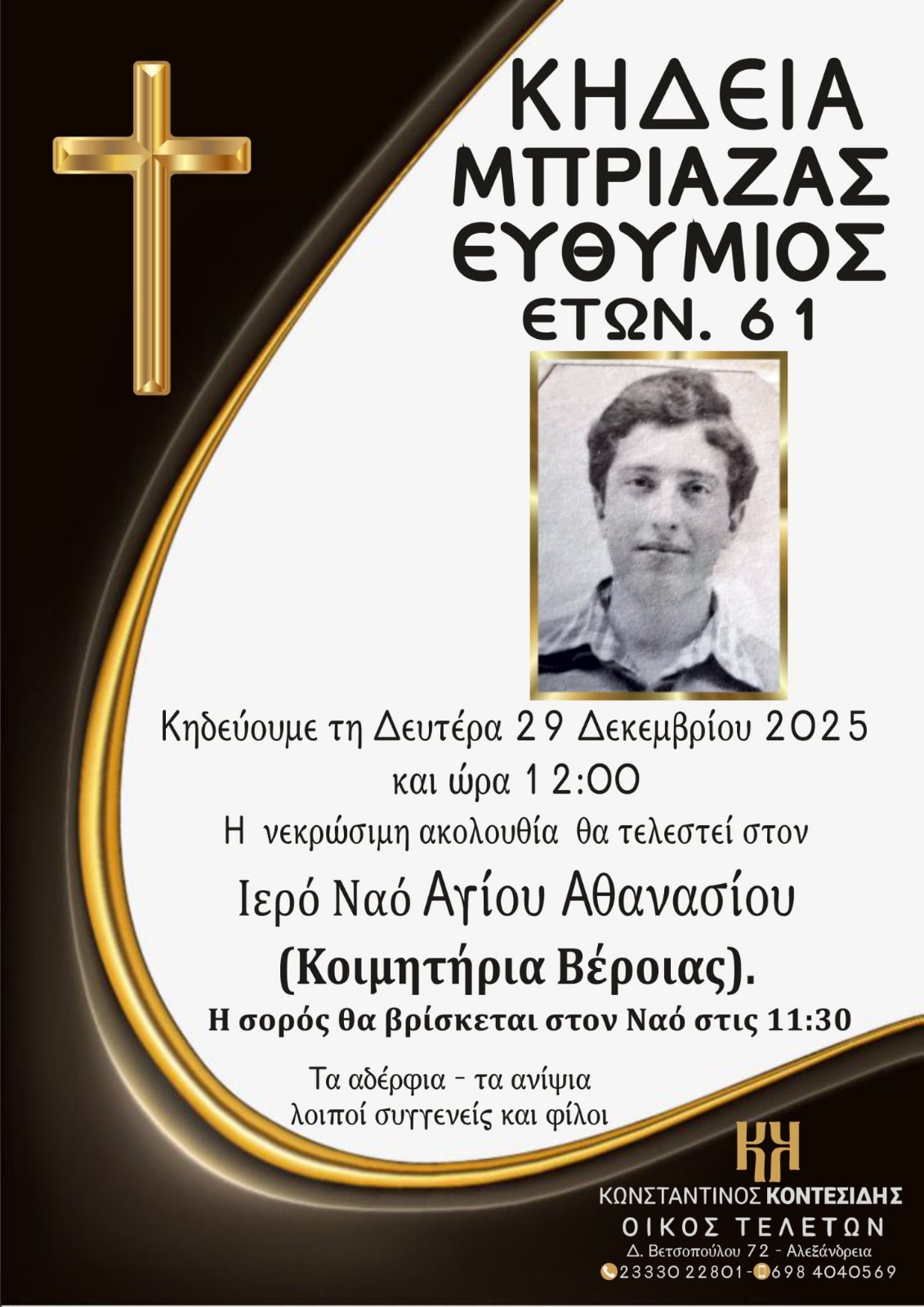 Η νεκρώσιμη ακολουθία θα τελεστεί την Δευτέρα 29 Δεκεμβρίου 2025 και ώρα 12:00 στον Ιερό Ναό Αγίου Αθανασίου (Κοιμητήρια Βέροιας).