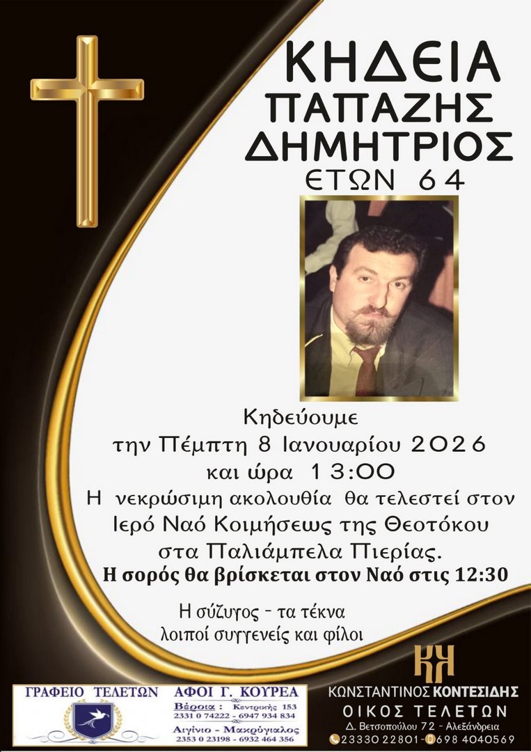 Η νεκρώσιμη ακολουθία θα τελεστεί σήμερα Πέμπτη 8 Ιανουαρίου 2026 και ώρα 13:00 στον Ιερό Ναό Κοιμήσεως Θεοτόκου στα Παλιάμπελα Πιερίας.
