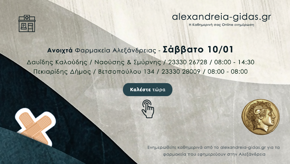 ΦΑΡΜΑΚΕΙΑ 10 Ιανουαρίου, 2026 posted by admin Share Ποια φαρμακεία είναι ανοιχτά σήμερα Σάββατο στην Αλεξάνδρεια 🔊 Ακούστε το άρθρο κάνοντας κλικ Αλεξάνδρεια: Αφήστε μια απάντηση Ακύρωση απάντησηςΗ ηλ. διεύθυνση σας δεν δημοσιεύεται. Τα υποχρεωτικά πεδία σημειώνονται με *Σχόλιο * Όνομα Email Ιστότοπος Αποθήκευσε το όνομά μου, email, και τον ιστότοπο μου σε αυτόν τον πλοηγό για την επόμενη φορά που θα σχολιάσω.