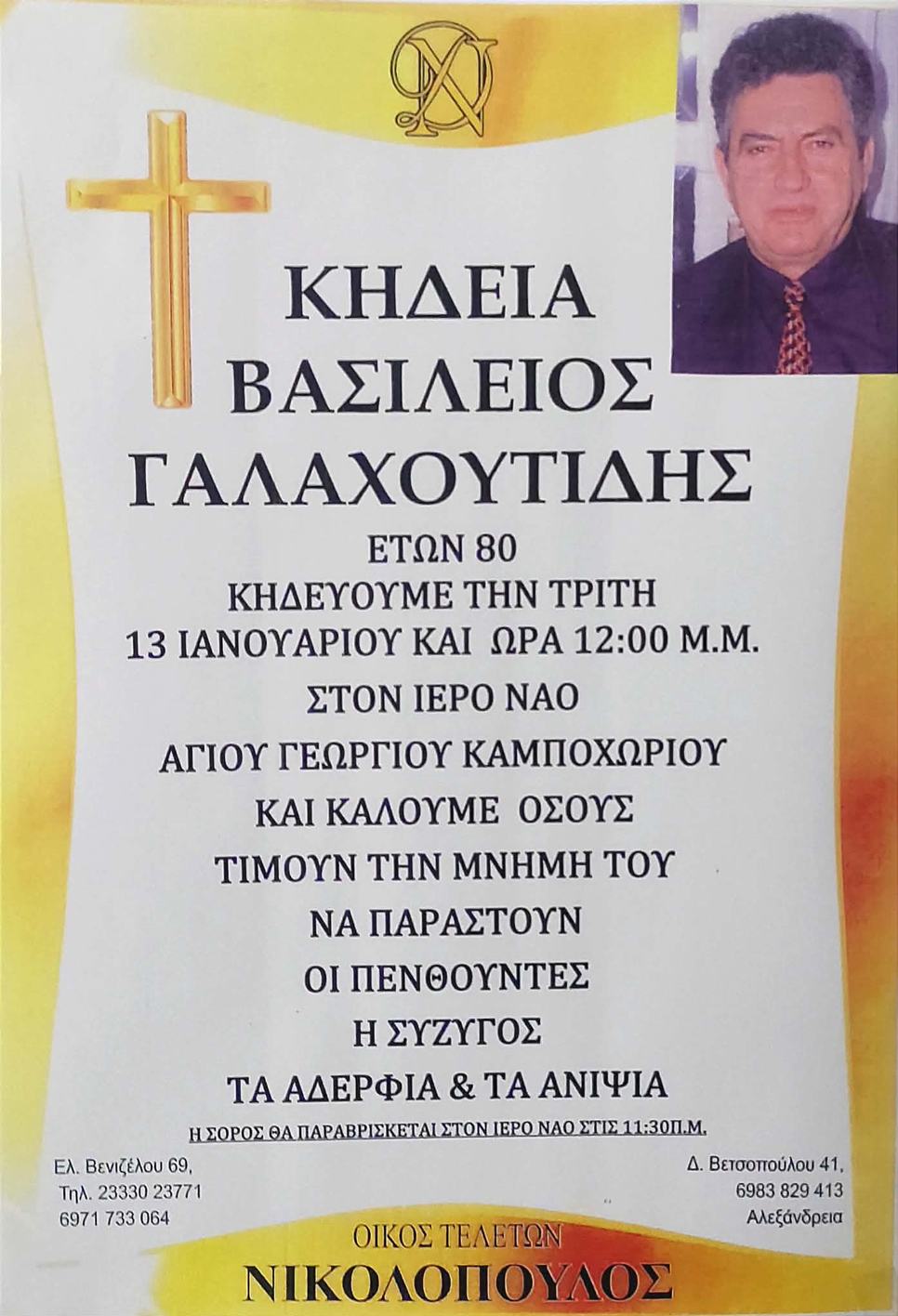 Η οικογένεια καλεί όσους τιμούν την μνήμη του, να παραστούν την Τρίτη 13 Ιανουαρίου 2026 στις 12:00 μ.μ. στον Ιερό Ναό του Αγίου Γεωργίου στο Καμποχώρι του δήμου Αλεξάνδρειας.