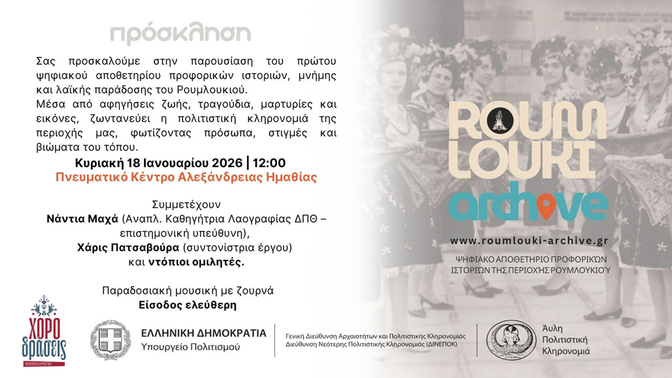 Η Αλεξάνδρεια Ημαθίας υποδέχεται με χαρά την εκδήλωση παρουσίασης του πολιτιστικού έργου “Roumlouki – Archive”, την Κυριακή 18 Ιανουαρίου 2026, στις 12:00 το μεσημέρι, στο Πνευματικό Κέντρο Αλεξάνδρειας.
