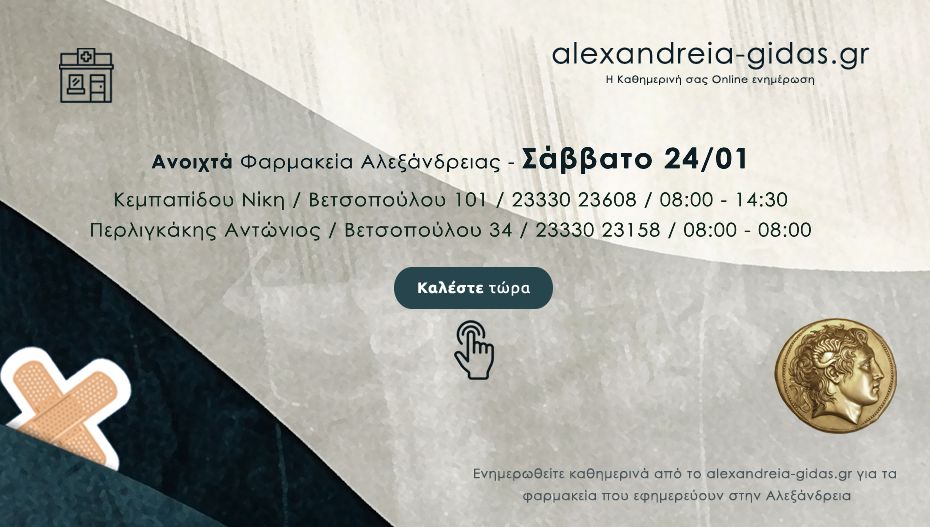 ΦΑΡΜΑΚΕΙΑ 24 Ιανουαρίου, 2026 posted by admin Share Ποια φαρμακεία είναι ανοιχτά σήμερα Σάββατο στην Αλεξάνδρεια 🔊 Ακούστε το άρθρο κάνοντας κλικ Αλεξάνδρεια: Αφήστε μια απάντηση Ακύρωση απάντησηςΗ ηλ. διεύθυνση σας δεν δημοσιεύεται. Τα υποχρεωτικά πεδία σημειώνονται με *Σχόλιο * Όνομα Email Ιστότοπος Αποθήκευσε το όνομά μου, email, και τον ιστότοπο μου σε αυτόν τον πλοηγό για την επόμενη φορά που θα σχολιάσω.