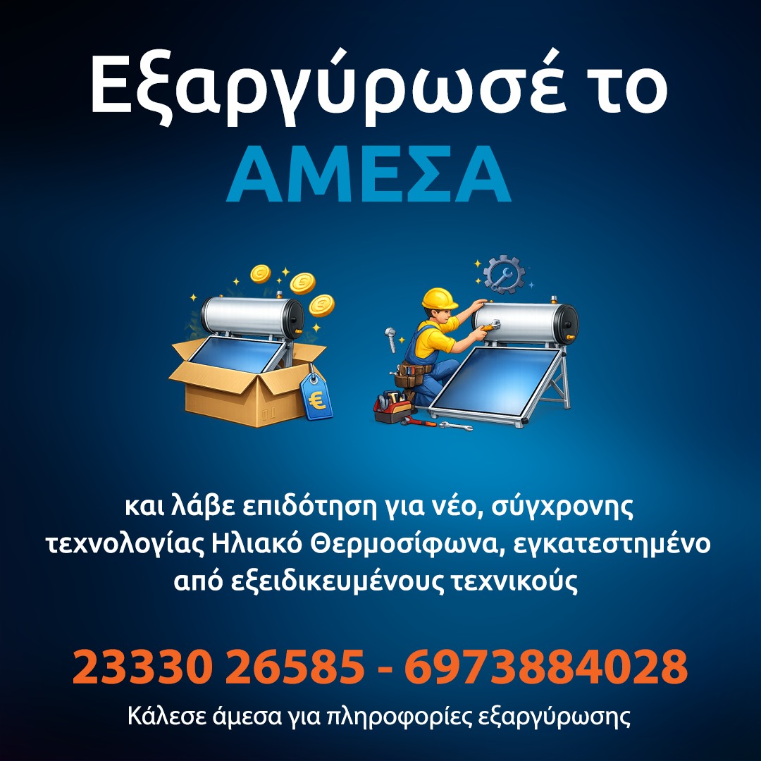 Επικοινώνησε άμεσα για να εξαργυρώσεις το voucher για το Πρόγραμμα «Αλλάζω σύστημα θέρμανσης και θερμοσίφωνα» και να λάβεις επιδότηση για νέο, σύγχρονης τεχνολογίας Ηλιακό Θερμοσίφωνα, εγκατεστημένο από εξειδικευμένους τεχνικούς!