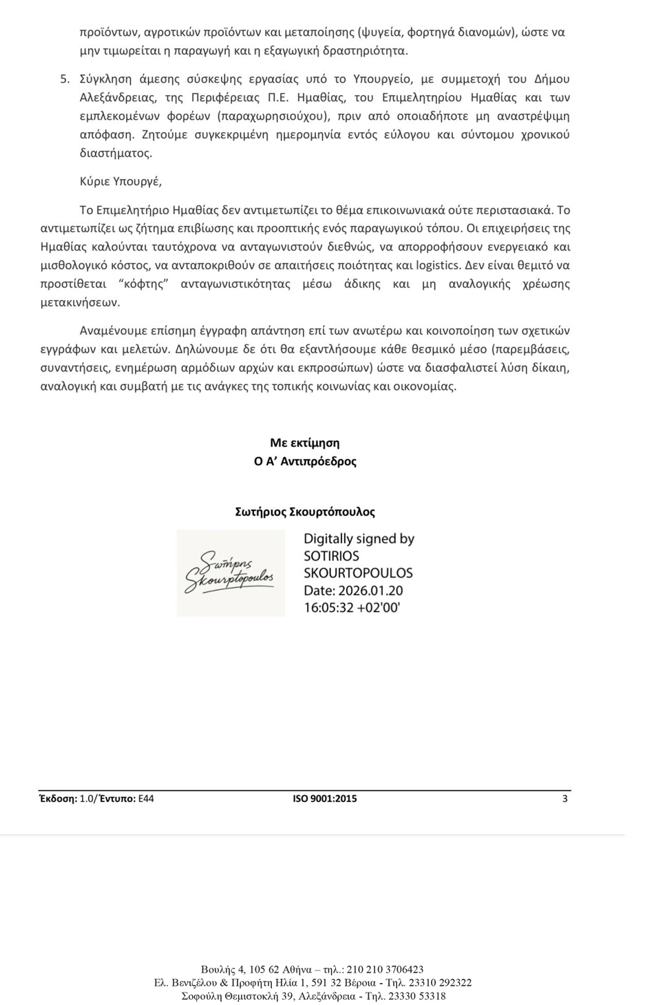 Συγκεκριμένα, ο Τάσος Μπαρτζώκας κατέθεσε ως Αναφορά τις επιστολές της Περιφερειακής Ενότητας Ημαθίας, του Δήμου Αλεξάνδρειας και του Επιμελητηρίου Ημαθίας, με τις οποίες επισημαίνονται οι σοβαρές κοινωνικές, οικονομικές και αναπτυξιακές επιπτώσεις που ενδέχεται να προκύψουν από μια τέτοια παρέμβαση.