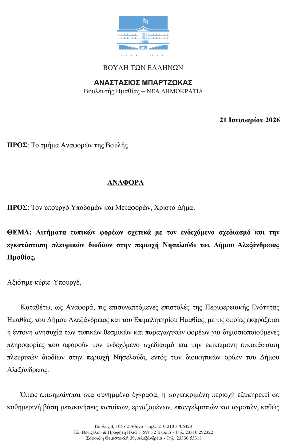 Κοινοβουλευτική Αναφορά στη Βουλή κατέθεσε ο Βουλευτής Ημαθίας Τάσος Μπαρτζώκας προς τον Υπουργό Υποδομών και Μεταφορών, Χρήστο Δήμα, μεταφέροντας τα αιτήματα και την έντονη ανησυχία των τοπικών φορέων σχετικά με τον ενδεχόμενο σχεδιασμό και την πιθανή εγκατάσταση πλευρικών διοδίων στην περιοχή Νησελούδι του Δήμου Αλεξάνδρειας.